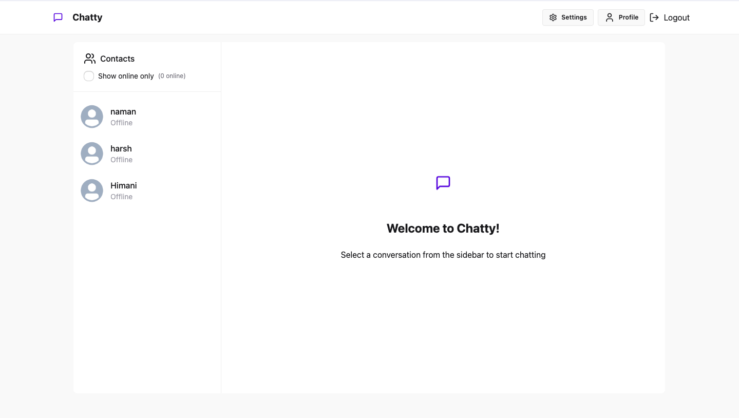 A full-stack real-time chat application built with React, Tailwind CSS, Node.js, Express, MongoDB, and Socket.io. Features include user authentication (sign in/sign out), real-time messaging, and the ability to view currently online users with a toggle option.